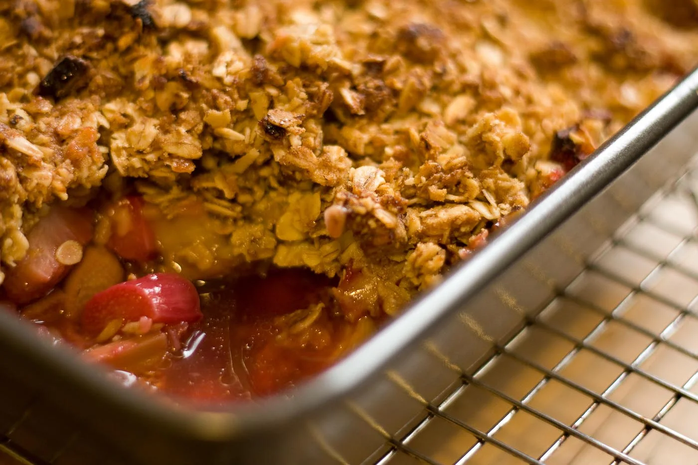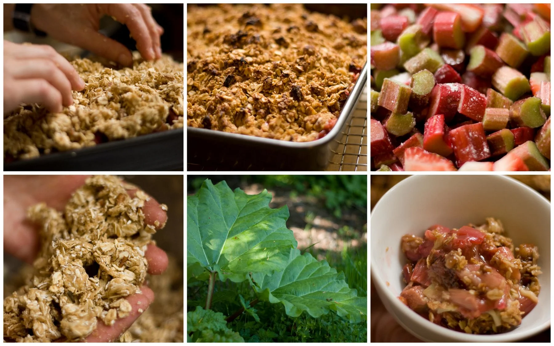 In a bowl, mix the flour and brown sugar with the butter and oatmeal. Press ¾ of the mixture into the bottom of a 9" pan; cover with the rhubarb. In a saucepan, mix all the remaining ingredients and cook over medium heat, stirring constantly, until it thickens. Pour over the rhubarb and sprinkle the remaining topping on top. Bake in a 350F oven for 45-60 minutes until it is oozy, bubbly and brown!