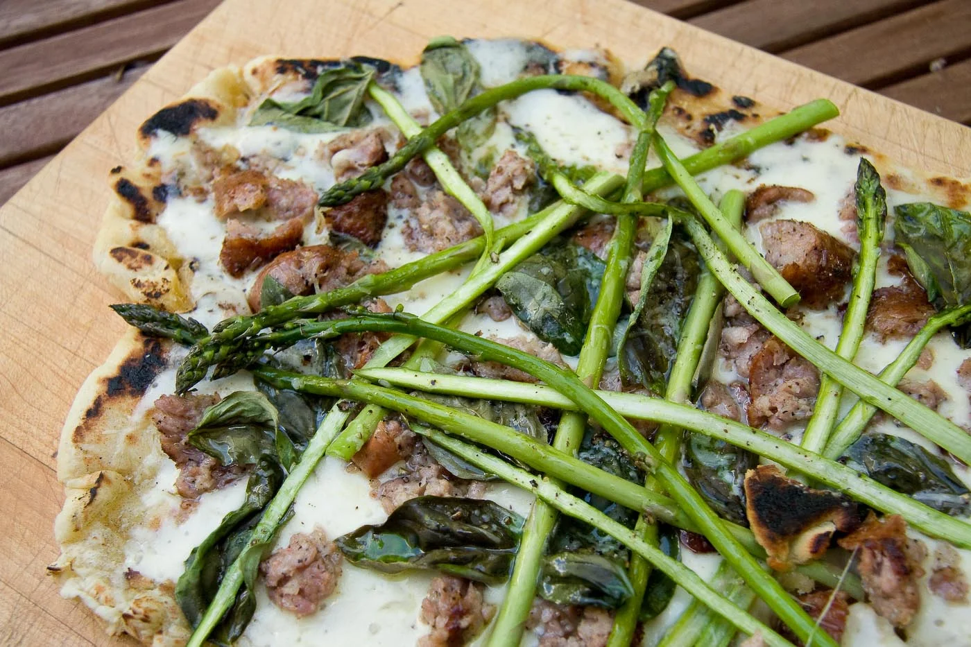 While scanning Twitter the other day, I came across a tweet by Smitten Kitchen about a "Shaved Asparagus Pizza". Having just purchased 2lbs of fresh asparagus at the market that morning, and wanting to try out my pizza stone on our Weber grill, I decided to take the Smitten Kitchen recipe and use it as guideline.