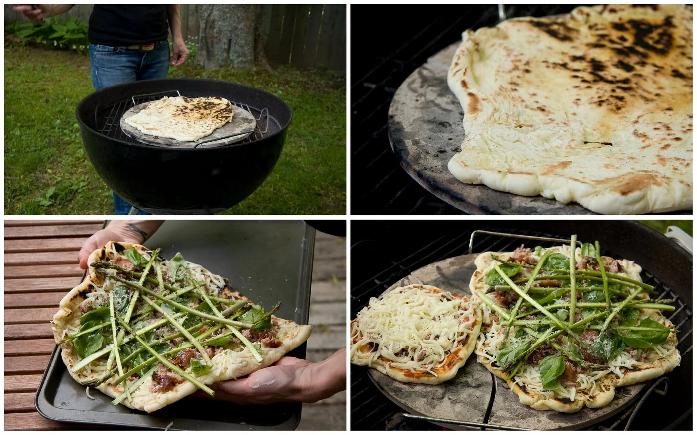 First, I made a quick and easy pizza dough in my mixer and let it rise (see recipe below). Next came the building of the fire. Using a charcoal grill always requires some planning ahead and some carefully honed fire making skills! FYI....my fire making skills are outstanding! As my grill started to heat up, I put my stone on the grill and allowed it come up to temperature. This gave me a chance to prep the rest of my ingredients. A little shaved parmigiano-reggiano, mozzarella, some beautiful local asparagus from Caribou Island, basil from Riverview Herbs and a few crumbled sausages from Sweet Williams (grilled in advance) rounded out our 'za toppings for the night.